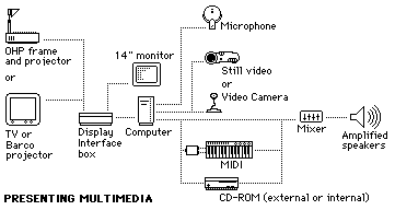 It consists of the following: Mac AV Computer or PC equivalent (with at least 40MB RAM, 1GB harddisc, and sound and video inputs and outputs), CD-ROM player (double-speed, multi-session, photo-CD compatable), MIDI keyboard with a simple (and cheap) MIDI control interface, small (and cheap) 4-channel sound mixer (to control sound output from the computer, CD-ROM player and MIDI player), external amplifed stereo speakers, computer input-microphone, still-video camera and video camera, display interface box (such as Videologic's Mediator) and projector or large TV monitor, or LCD viewframe and overhead 400W (min.) projector.